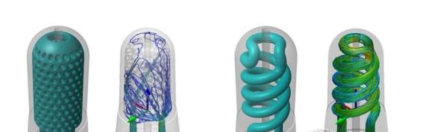 下面的圖片顯示了優(yōu)化網(wǎng)狀網(wǎng)絡(luò)通道的過程。左手這對(duì)圖像顯示的網(wǎng)格設(shè)計(jì)和模擬仿真效果-大量的低速流動(dòng),不均勻分布的冷卻液。右手這對(duì)圖像顯示的是連續(xù)冷卻通道設(shè)計(jì)與仿真效果,具有高和一致的流量。右手的設(shè)計(jì)帶來冷卻液流量50%以上的提高,顯著提高冷卻效果。