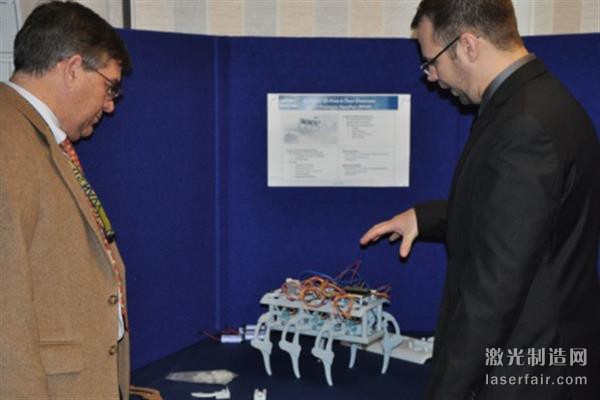 更令人印象深刻的是活動(dòng)中展出的六足機(jī)器人(HexPod Robot),該機(jī)器人仍處于開發(fā)階段。它的目標(biāo)是輔助作戰(zhàn)人員,比如通過(guò)低功耗運(yùn)動(dòng)穿越困難地形等。這款機(jī)器人從最初的概念到變成一個(gè)完整的3D打印原型只用了四個(gè)星期(原本通常要用3到4個(gè)月)。有趣的是,在離活動(dòng)只有12個(gè)小時(shí)的時(shí)候,工程師們還通過(guò)快速調(diào)整減輕了它的重量,因?yàn)樗麄冇X(jué)得它太重了。