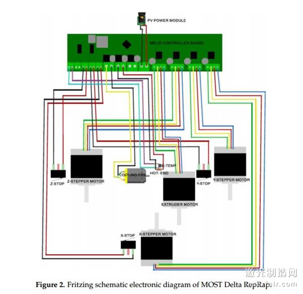 在這項(xiàng)研究中,研究人員將一個(gè)靠太陽(yáng)能光伏發(fā)電的移動(dòng)系統(tǒng)與Delta式3D打印系統(tǒng)結(jié)合起來(lái),并充分利用最近出現(xiàn)的一些3D打印創(chuàng)新,以盡可能地降低能源消耗。“打印床表面處理的改進(jìn)、像PLA這樣的低溫線材材料的采用,減少了新型3D打印機(jī)中步進(jìn)電機(jī)的數(shù)量和消除了對(duì)熱床的需要,從而能夠大幅減少了機(jī)器功耗。”研究人員們解釋稱(chēng)。他們使用的電池是一種聚合物鋰離子可再充電電池組(14.8V,20Ah),這種電池組擁有一種過(guò)充保護(hù)電路,這使得它在低光照條件下也能夠備份/存儲(chǔ)能量。