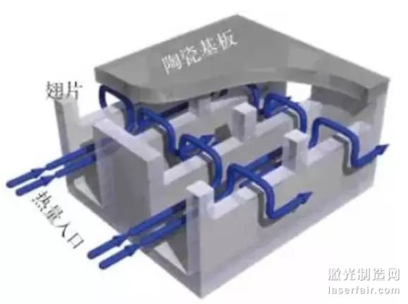 該散熱器基于層流條件下熱傳導(dǎo)的微通道較短的原理,眾多短小的微通道相互并聯(lián),以提高熱傳導(dǎo)的面積,并采用水作為冷卻液。