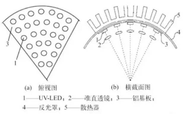 其陣列結(jié)構(gòu)如圖(a)所示,若干大功率UV-LED組成扇形陣列安裝在鋁基板上,每層UV-LED等間隔分布在以O(shè)為圓心的圓弧上。沿半徑方向上LED芯片的個(gè)數(shù)逐漸線性增加,從而輻照度沿徑向逐漸增加。