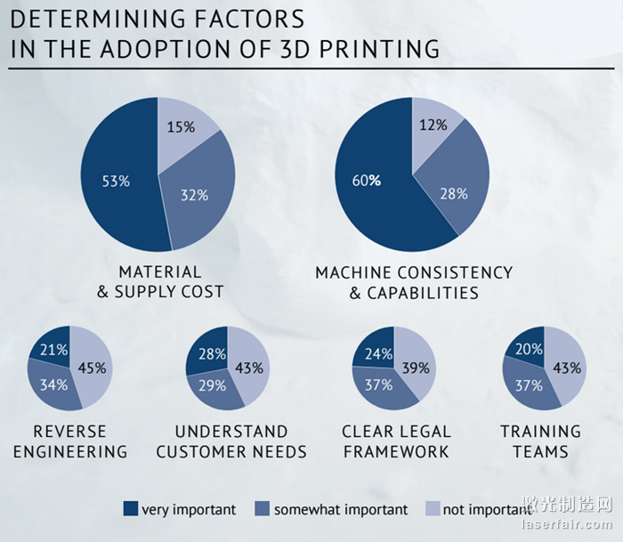 根據(jù)調(diào)查結(jié)果,在這16個(gè)垂直市場中,決定一家企業(yè)是否采用3D打印技術(shù)最重要的因素是“材料和供應(yīng)成本(Material and Supply Cost)”和“機(jī)器的穩(wěn)定性和能力(Machine Consistency and Capabilities)”。對于其它決定企業(yè)采用3D打印技術(shù)的因素,幾乎一般的受訪者認(rèn)為以下四類是最不重要的:“逆向工程(Reverse Engineering)”、“了解客戶需求(Understanding Customer Needs)”、“明確的法律框架(Clear Legal framework)”、“訓(xùn)練團(tuán)隊(duì)(Training Teams)”。