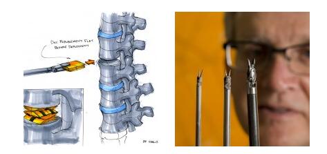 在論文中,這些手術(shù)工具包括一個(gè)小到可以穿過(guò)3毫米寬的洞的工具鉗。D-Core一開(kāi)始是扁平的,可以通過(guò)切口插入,而一旦進(jìn)入人體內(nèi)就可以擴(kuò)展成為兩個(gè)圓形的表面,模擬椎間盤(pán)彼此滾動(dòng)。