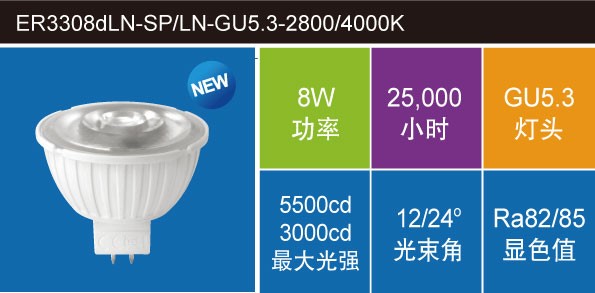 曼佳美照明最新款 LED MR16 反射燈 - ER3308dLN,光束角最小可達12°,能夠完美凸顯照射對象優(yōu)美的輪廓曲線。