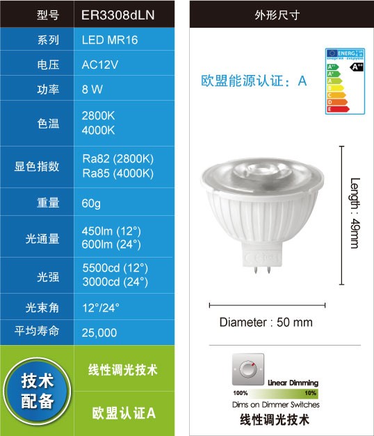 隨著社會的發(fā)展,生活的品質(zhì)提高,人們對于照明效果的要求,不僅僅再局限于“亮度”的問題,而是更加注重燈光所營造的氛圍。最新款 LED MR16 反射燈 - ER3308dLN線性調(diào)光技術(shù)與品質(zhì)光效相結(jié)合。成為氣氛照明的不二之選。