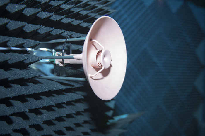 據(jù)了解,這次測試是在荷蘭Noordwijk的ESA ESTEC技術中心進行的。在測試空間內隔絕了外部的電磁輻射,而其內部的墻壁上則掛滿了“消聲”泡沫以吸收無線電信號,以此來模擬無限的太空。
