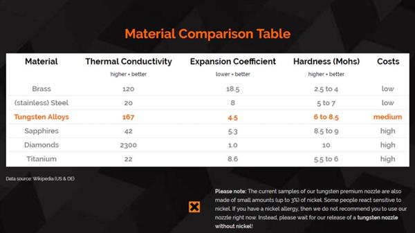 目前該鎢質(zhì)噴嘴使用的是M6螺紋,可支持1.75毫米線材,如果他們的眾籌獲得成功的話,該公司還希望能夠再推出一個(gè)支持2.85/3毫米線材的鎢噴嘴。如前所述,由于其能夠承受很高的溫度,并就有很好的耐磨性,因此該噴嘴適用的材料范圍很廣,目前可支持的材料包括PEEK、尼龍、ABS、聚碳酸酯(M6)、甚至包括一些很磨噴嘴的材料,如碳纖維等。