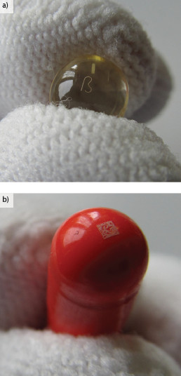 圖3:紫外線(xiàn)激光標(biāo)記的軟膠囊(a)和硬膠囊(b)。