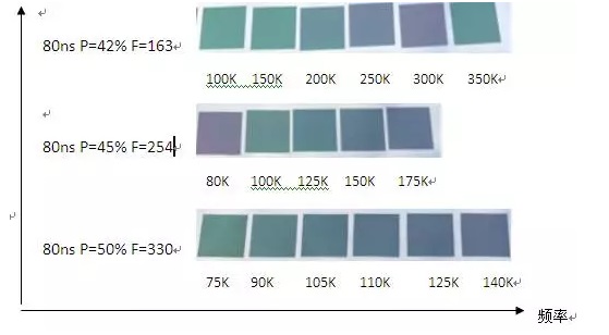 從故事(1)中我們就推導(dǎo)過:在大焦距鏡頭中,功率值的增加,維持了激光功率密度的穩(wěn)定。但若再以此頻率下的激光脈沖作用到材料表面,那則會(huì)使脈沖重疊率變大,這其實(shí)會(huì)變相的改變了材料單位面積內(nèi)所受的激光能量。因此,在光斑擴(kuò)大情況下,必須降低頻率以維持原來的光斑重疊率,這樣色彩的一致性會(huì)更高。如果功率值減小,情況反之。理論分析了這么多,實(shí)踐才是檢驗(yàn)真理的唯一標(biāo)準(zhǔn)。實(shí)際情況到底如何呢?