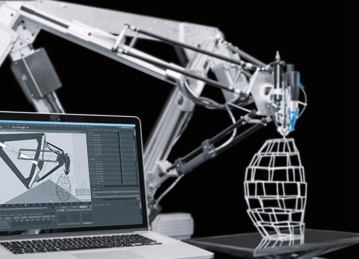 據(jù)了解,綁在其三腳架似的機(jī)械定位系統(tǒng)的末端的是一個(gè)精確的噴絲頭,這個(gè)噴絲頭上使用的是均勻的2400tex玻璃纖維。此外還有一臺(tái)計(jì)算機(jī)與其連接,通過定制的3D建模軟件為其提供需要的位置數(shù)據(jù)。