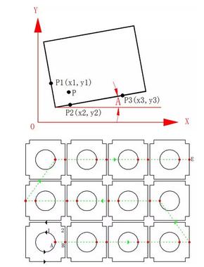 啟動(dòng)自動(dòng)尋邊功能后,切割頭從P點(diǎn)出發(fā),自動(dòng)測(cè)得板料兩垂直邊上的3點(diǎn):P1、P2、P3,并據(jù)此自動(dòng)計(jì)算出板料的傾斜角度A,以及板料的原點(diǎn)。