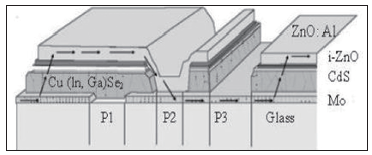 P3 :制備前電極、窗口層,并對該層薄膜進行劃線,要求將前電極層和吸收層全部去除,但不損壞背電極Mo和襯底,以實現(xiàn)電池的分離。