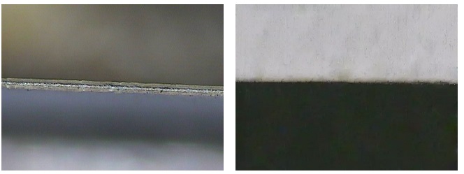 正極陶瓷層中間為鋁箔,兩邊為白色絕緣陶瓷層,厚度100μm,切縫層次明顯,棱角分明,邊緣整齊無掛渣。熱影響區(qū)域小于0.03mm