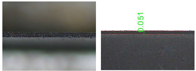 負極極片中間為銅箔,兩邊為電鍍石墨層,切縫層次分明,邊緣平整,無熔珠,熱影響區(qū)域小于0.051mm厚度80μm