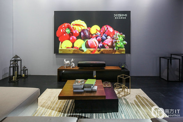 本次,T1標(biāo)配120英寸抗光幕布??构饽徊疾粌H可以有效降低環(huán)境光對畫面的干擾,讓畫面色彩始終如一,同時還能提升畫面對比度,并避免由墻面不平整造成的畫面扭曲。此外,T1投射比為0.189:1,是目前市面上投射比最好的激光電視。用戶無需改變客廳格局,只需將T1放在電視柜上,保持機身距離墻面約18cm就能投射120英寸畫面。