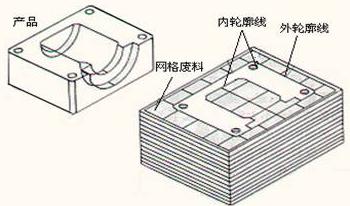 在這種快速成形機(jī)上,截面輪廓被切割和疊合后所成的制品,如上圖所示。其中,所需的工件被廢料小方格包圍,剔除這些小方格之后,便可得到三維工件。