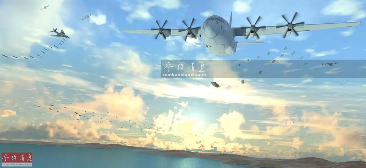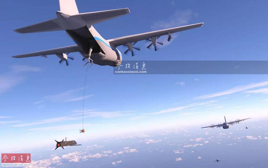 早期概念圖中,左側(cè)的B-1B轟炸機正在投放“小妖怪”無人機,而右側(cè)的C-130運輸機正在進行空中回收無人機作業(yè)。