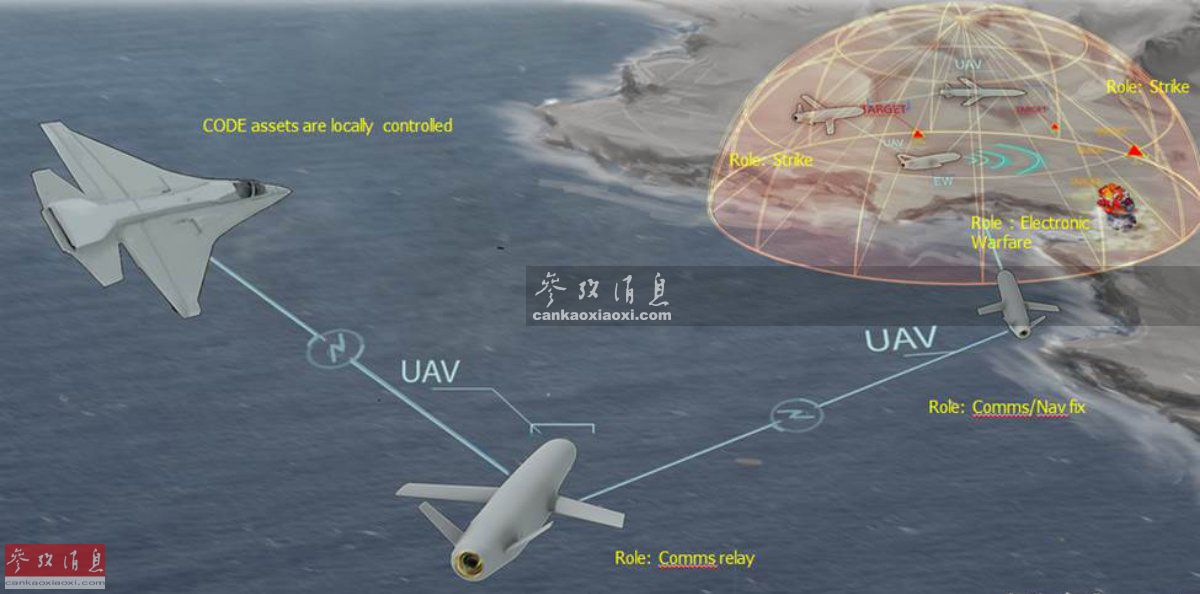戰(zhàn)術(shù)技術(shù)辦公室”(TTO)的目前正在進行“拒止環(huán)境下協(xié)同作戰(zhàn)”(CODE)項目研究,目的是為現(xiàn)役或未來無人機開發(fā)先進算法和軟件,拓展其在拒止或?qū)箍沼虻膶占皩Φ刈鲬?zhàn)能力,項目重點關(guān)注研發(fā)及驗證改進的協(xié)同自主性,使無人機蜂群能在一名操作員(例如F-35有人戰(zhàn)機飛行員)的遙控下,完成跟蹤、攻擊等任務(wù)。