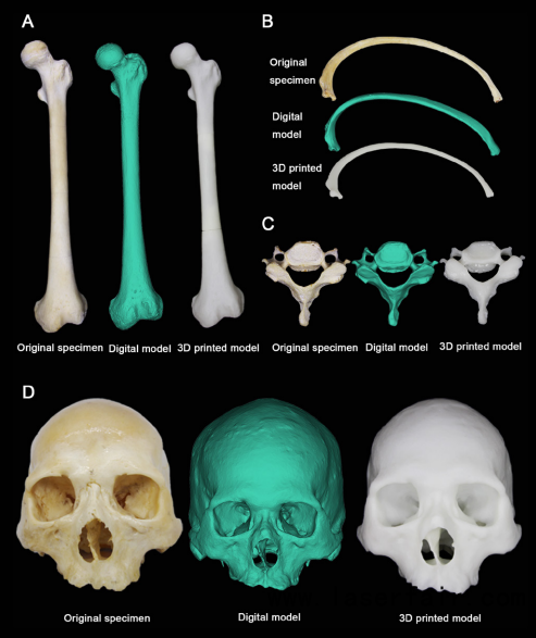 使用SLA技術制成的原始樣本,數(shù)字模型和3D打印模型。(A)股骨,(B)肋骨,(C)頸椎骨,(D)頭骨。
