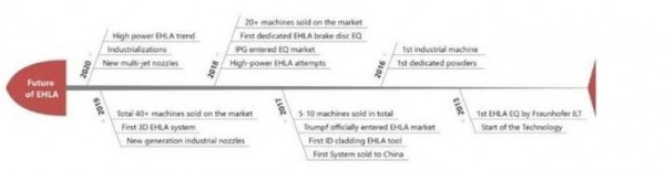 Fraunhofer ILT開(kāi)發(fā)的EHLA的發(fā)展(2013年開(kāi)發(fā)EHLA, 2016年第一臺(tái)設(shè)備,2017年市場(chǎng)化5-10臺(tái)設(shè)備,通快進(jìn)入EHLA商業(yè)化領(lǐng)域,2018年市場(chǎng)化20多臺(tái)設(shè)備,2019年市場(chǎng)化40多臺(tái)設(shè)備,2020年開(kāi)發(fā)面向產(chǎn)業(yè)化的多噴頭高通量EHLA技術(shù))。