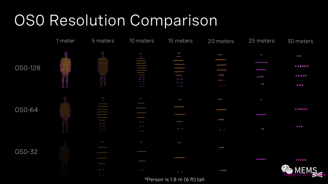 OS0系列分辨率對比,有效距離:OS0-32為10 m,OS0-64為20 m,OS0-128為30 m