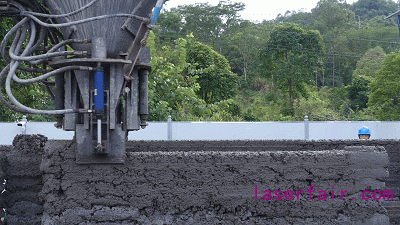 施工現(xiàn)場,3D打印機(jī)的打印頭架設(shè)在X軸、Y軸、Z軸上,以便對其進(jìn)行準(zhǔn)確的空間定位。工人們往打印頭注入混凝土后,打印頭根據(jù)在軟件中預(yù)設(shè)好的打印路徑,開始環(huán)繞著墻體,一層層地?cái)D出規(guī)整的混凝土。僅10分鐘的時(shí)間,電房墻體的高度便上升了6公分。