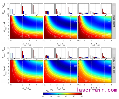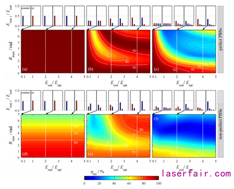 值得注意的是,在輸出能量的值接近飽和能量四倍的情況下(每個(gè)子脈沖能量都與飽和能量相當(dāng)),盡管沒(méi)有SPM和KK關(guān)系引入子脈沖間的相差,合成效率也會(huì)因過(guò)強(qiáng)的增益飽和而顯著降低,且被動(dòng)DPA系統(tǒng)不能補(bǔ)償這種由純粹強(qiáng)度失衡導(dǎo)致的低合成效率(圖6綠色虛線)。但是,強(qiáng)度差異引起的合成效率降低可以通過(guò)主動(dòng)的DPA系統(tǒng)完美解決(圖6綠色實(shí)線):先獨(dú)立調(diào)節(jié)輸入端的半波片角度,使輸入脈沖分為能量前低后高的子脈沖序列,以補(bǔ)償增益飽和給放大后子脈沖帶來(lái)的能量差,這樣獲得的相等幅度的放大子脈沖,再通過(guò)獨(dú)立調(diào)節(jié)輸出端半波片的角度來(lái)完美合成,從而產(chǎn)生極高的合成效率。除此以外,增加分脈沖數(shù)量也是優(yōu)化合成效率的常用方法,其不僅能降低每個(gè)子脈沖的峰值功率,從而降低非線性的強(qiáng)度,還可以減弱增益飽和對(duì)脈沖造成的影響。