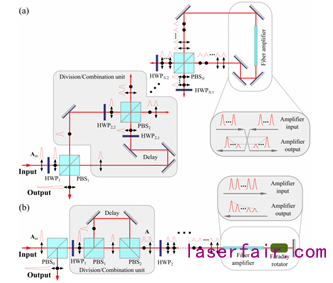 分脈沖放大(Divided-pulse amplification, DPA)是一種常用的相干合成技術(shù):在DPA系統(tǒng)中,通過(guò)在放大前將初始脈沖等分成時(shí)域上分離的子脈沖串,以降低脈沖在放大時(shí)的峰值功率;子脈沖串經(jīng)過(guò)放大之后重新合成為一個(gè)脈沖。DPA的相干合成效率主要受到三方面的限制:(1)增益飽和導(dǎo)致子脈沖間的強(qiáng)度差異;(2)非線性效應(yīng)將子脈沖間的強(qiáng)度差異轉(zhuǎn)化為相位差異;(3)器件缺陷。本文介紹的兩篇文獻(xiàn)均對(duì)啁啾脈沖-分脈沖放大系統(tǒng)(CPA-DPA)進(jìn)行了詳細(xì)的數(shù)值模擬,并重點(diǎn)研究了合成效率與增益飽和的關(guān)系。