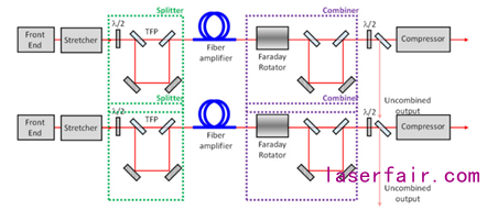 為了獲得毫焦量級(jí)的脈沖能量和數(shù)個(gè)吉瓦的峰值功率,摻鐿光纖放大系統(tǒng)通常使用極大模場(chǎng)直徑(MFD)的增益光纖并結(jié)合啁啾脈沖放大(CPA)技術(shù)。進(jìn)一步提升脈沖能量和峰值功率依賴于近些年發(fā)展的相干合成技術(shù)。