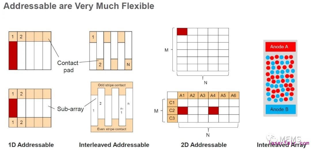 (3)2D可尋址VCSEL(下圖左起第三張圖),有兩種實(shí)現(xiàn)方式,分別為共陰極、多陽極形式,和獨(dú)立陰極陽極形式;