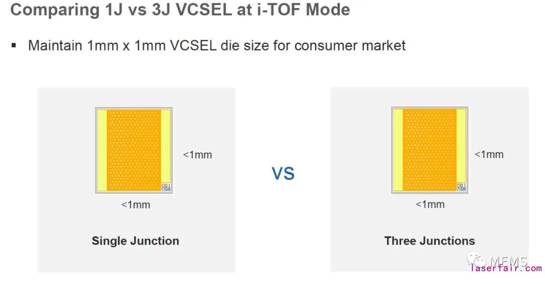 iToF模式工作的單結(jié)VCSEL和三結(jié)VCSEL:芯片面積不變,單位功率密度大幅提升