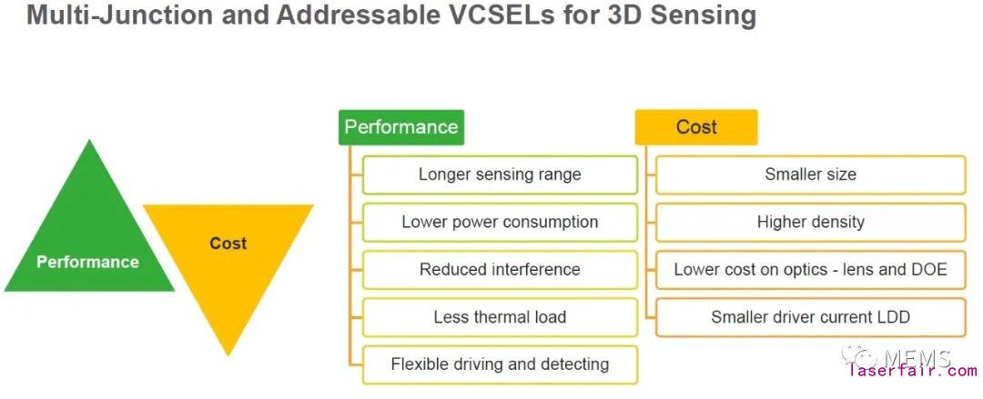 Lumentum追求對(duì)VCSEL產(chǎn)品性能持續(xù)不斷的提升,同時(shí)努力降低成本,因此要在解決方案的設(shè)計(jì)層面進(jìn)行優(yōu)化——多結(jié)VCSEL(也稱:多層結(jié)VCSEL)因此而誕生。計(jì)超先生分析了多結(jié)VCSEL的諸多優(yōu)勢(shì):“首先體現(xiàn)在功率和PCE(電光轉(zhuǎn)換效率)。多結(jié)VCSEL能提供更高的功率密度,對(duì)光學(xué)系統(tǒng)設(shè)計(jì)更加友好;其次,多結(jié)VCSEL增加了斜率效率。采用多結(jié)之后,驅(qū)動(dòng)電源稍微提高,同時(shí)大幅降低芯片驅(qū)動(dòng)電流,高壓小電流的激光驅(qū)動(dòng)器更易實(shí)現(xiàn)。此外,多結(jié)VCSEL其實(shí)是一種降低VCSEL成本的優(yōu)秀方案。獲得相同的功率,多結(jié)VCSEL只需單結(jié)芯片面積的二分之一或者三分之一就可以實(shí)現(xiàn),這對(duì)成本節(jié)約非常有幫助?!?/p>