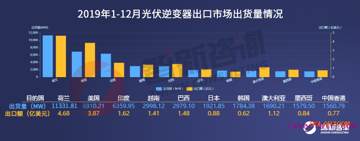 根據(jù)智新咨詢統(tǒng)計(jì),2019年中國光伏組件、電池、逆變器主要出口國家(地區(qū))如下:
