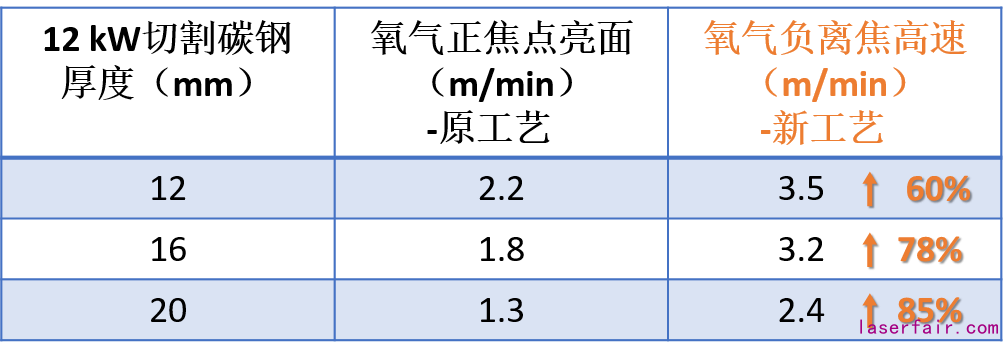 經(jīng)工藝應(yīng)用測試,功率在12 kW及以上激光器采用碳鋼氧氣負(fù)離焦高速切割工藝,能顯著提升切割能力,效率和質(zhì)量。并且,隨著功率的提高,加工速度顯著提升,工件更容易落料,同時加工穩(wěn)定性也進(jìn)一步提升。