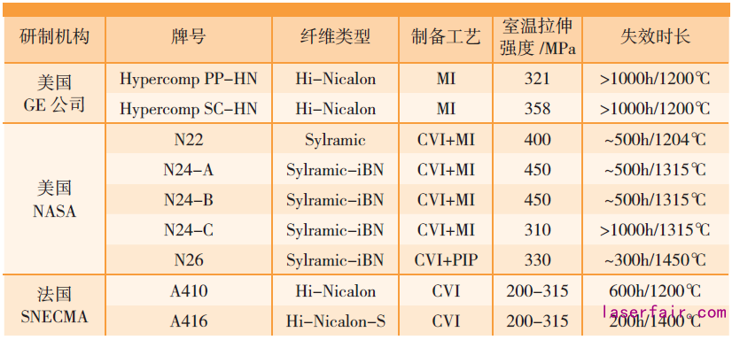 國(guó)外不同型號(hào)的CMC材料和性能。