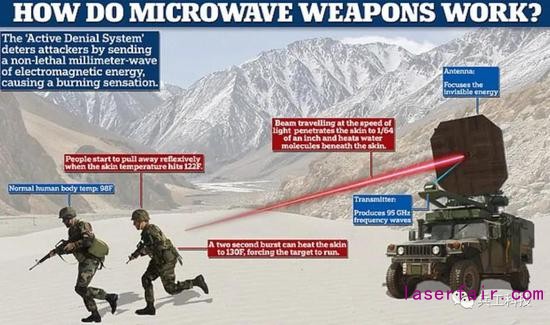 微波武器其實(shí)是一個(gè)非常寬泛的概念,如近年來(lái)在警用裝備展上多次出現(xiàn)的定向能防暴拒止系統(tǒng)其實(shí)就是微波武器,這種系統(tǒng)采用的低能量波束,可以使人感到灼熱疼痛,但不會(huì)造成永久性傷害,就如同小型的激光眩目武器一樣,在真正的戰(zhàn)爭(zhēng)中發(fā)揮非常有限。