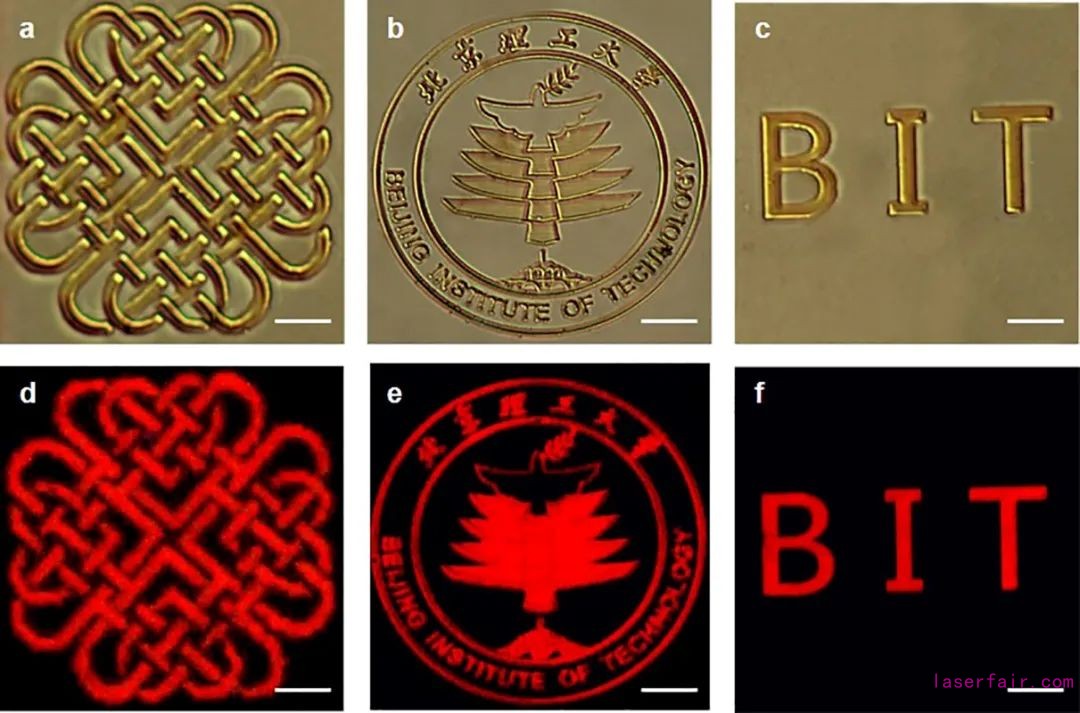 此外,為了證明該技術(shù)的普適性,研究人員展示了更加復(fù)雜圖案的制備。圖3顯示了使用OLYMPUS MX51光學(xué)顯微鏡在白光(圖3a–c)和UV-365 nm光照(圖3d–f)下制作的圖案化鈣鈦礦量子點(diǎn)的光學(xué)圖像。圖3 熒光顯微鏡下圖案化的鈣鈦礦量子點(diǎn)的復(fù)雜結(jié)構(gòu) (標(biāo)尺:10 μm)