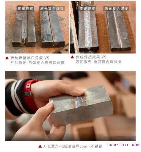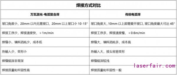 若使用萬(wàn)瓦激光-電弧復(fù)合焊,20mm以下的鋼板不需要開坡口即可完成焊接,20mm以上鋼板只需要開傳統(tǒng)坡口角度的四分之一即可,大大壓縮坡口間隙,所需焊料成本更小,且效率可提高6-10倍,實(shí)現(xiàn)生產(chǎn)效率和制造精度的雙重提升,牢固性也更強(qiáng)。