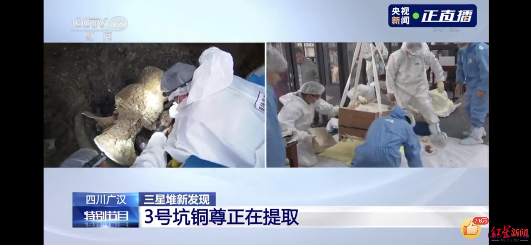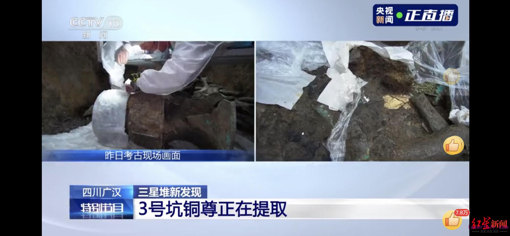 今日(3月21日),考古隊(duì)員對(duì)3號(hào)坑的一尊重達(dá)200斤以上的銅尊進(jìn)行提取。據(jù)了解,這件銅尊是此次考古發(fā)現(xiàn)的最大一件銅尊。為了將這個(gè)“大家伙”安全提取出,在之前,考古人員已對(duì)該銅尊用石膏進(jìn)行澆筑。