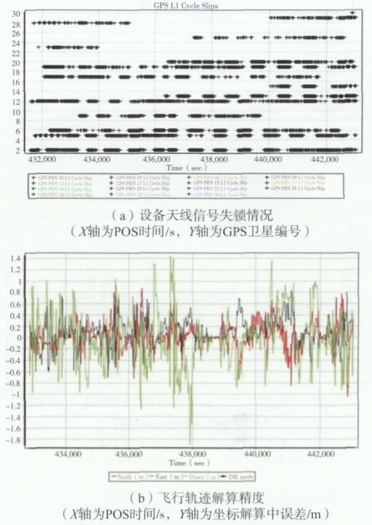 從圖4可以看出,主螺旋槳轉(zhuǎn)動時,GNSS信號接收仍然有失鎖情況,但對定位精度影響已經(jīng)不大,地面開車測試時,GNSS基準(zhǔn)站距飛機(jī)2km,POS數(shù)據(jù)解算結(jié)果為位置誤差±3cm、高程誤差±5cm;飛行作業(yè)時,GNSS基準(zhǔn)站距作業(yè)區(qū)30km范圍內(nèi),POS數(shù)據(jù)解算結(jié)果為位置誤差±6cm、高程誤差±10cm,測量成果能夠滿足《海道測量規(guī)范》要求。