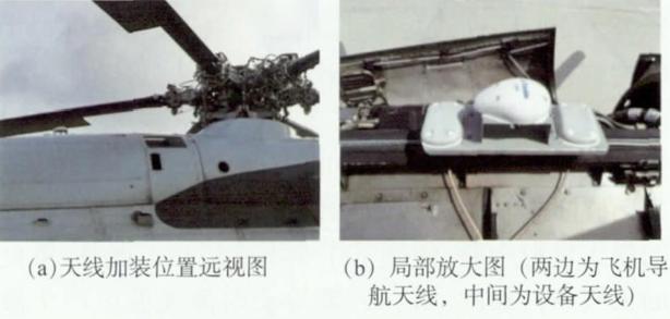 機(jī)載設(shè)備天線的安裝位置對數(shù)據(jù)精度的影響較大。試驗采用直升機(jī)平臺,飛機(jī)有主螺旋槳和尾翼穩(wěn)定螺旋槳,其中主螺旋槳旋轉(zhuǎn)時覆蓋整個機(jī)身,尾翼部分不方便安裝天線,加之試驗用的GNSS天線屬于臨時性加裝,不允許對飛機(jī)機(jī)身進(jìn)行改動,因此,經(jīng)過討論分析,GNSS天線安裝在飛機(jī)自帶的兩個導(dǎo)航天線中間(見圖1),距主螺旋槳軸約2m。