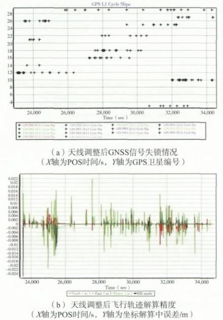 飛機(jī)返場重新調(diào)整天線位置,分別在駕駛艙和主螺旋槳與尾翼螺旋槳的結(jié)合部等飛機(jī)不同部位進(jìn)行了信號質(zhì)量測試,測試結(jié)果表明,GNSS天線安裝在主螺旋槳與尾翼螺旋槳的結(jié)合部時,信號質(zhì)量最佳。天線安裝位置見圖3,天線位置調(diào)整后信號失鎖情況見圖4。