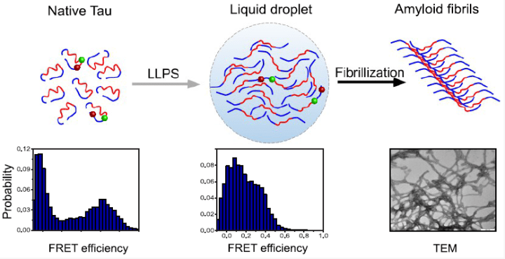 生物大分子相變是近年來生物學(xué)領(lǐng)域新興的研究熱點,生物大分子通過液-液相分離(Liquid-Liquid Phase Separation,LLPS)可動態(tài)組裝成無膜細(xì)胞器,執(zhí)行多種重要生物學(xué)功能。Tau蛋白作為一種無序蛋白,在正常生理狀態(tài)下,具有結(jié)合微管并調(diào)控其組裝成束和穩(wěn)定性的功能。Tau蛋白異常聚集形成纖維纏結(jié)被認(rèn)為與包括阿爾茲海默癥在內(nèi)的多種神經(jīng)退行性疾病發(fā)生密切相關(guān)。