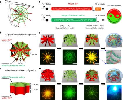 重組蛛絲蛋白的基因或介觀修改可以賦予 3 D 納米組件和納米器件不同的功能。得益于合理的設(shè)計和獨創(chuàng)性,蛛絲可以從不同的角度進行重組,并且 3D 納米結(jié)構(gòu)的組成、形狀和功能能夠得到很好地配置。這就為使用 3D EBL 制造的功能性重組蛛絲蛋白中構(gòu)建異質(zhì)、分層的納米結(jié)構(gòu)提供了可能。