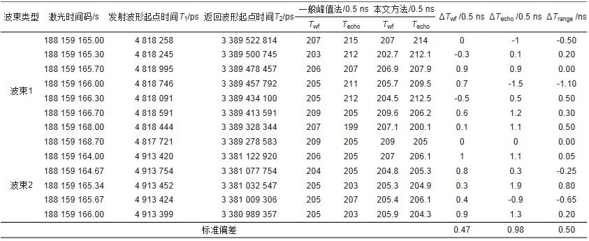 由表 1結(jié)果可分析,無論是星載激光測高儀發(fā)射波形還是返回波形,經(jīng)本文方法擬合后波形峰值時刻發(fā)生了一定偏移。其中,相對于一般峰值法,本文方法提取的發(fā)射波形峰值點位置偏移了0.235 ns;本文方法提取的返回波形峰值點位置偏移了0.49 ns。將發(fā)射波形與返回波形峰值偏移量應(yīng)用于GF-7星載激光測高儀測距計算式(4)之中,本文方法提取的激光渡越時間與一般峰值法提取的渡越時間偏差為0.50 ns,相當(dāng)于7.5 cm的測距誤差。根據(jù)上述分析可知,本文方法能夠明顯減小激光測距隨機誤差。