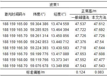 假設(shè)理想條件下,即激光測距無誤差、同一無風(fēng)浪湖面或冰面上的激光測高應(yīng)該完全一致。因此,激光在冰面或無風(fēng)浪湖面的高程相對偏差直接大致可以反映出星載激光測高儀測距精度。結(jié)合表 3冰面的試驗結(jié)果分析,由表 1中可以看出,相對于一般峰值法,基于本文方法提取的激光測距精度提升了7.5 cm。