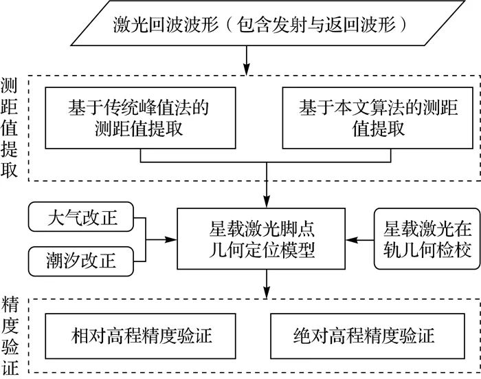 本文采用控制變量法,在僅改變激光測距值條件下進行激光腳點高程計算,對比在不同測距值下的高程精度。首先,根據(jù)星載激光在軌幾何定位原理,考慮大氣[22-23]、潮汐[24-25]引起的測距誤差,構(gòu)建嚴(yán)密幾何定位模型[4];然后,利用一般峰值法與本文方法提取的測距值分別計算激光點高程;最后,利用平靜湖面、冰面及高精度LiDAR數(shù)據(jù),進行兩類測距值的激光點高程相對精度與絕對精度對比。其流程如圖 6所示。