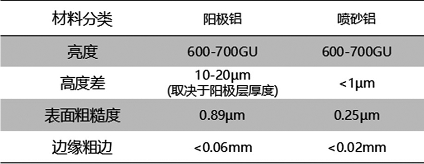 采用200W脈沖連續(xù)光纖激光器,高功率的激光能量將鋁合金材料表面融平。該激光器可輸出連續(xù)光或脈沖光,因此可分別對噴砂鋁和陽極鋁進行高亮處理,噴砂鋁直接用連續(xù)光進行高亮鐳雕,陽極鋁則需要先用脈沖光對陽極層進行破陽,再用連續(xù)光進行高亮鐳雕。加工后高亮效果對比如圖6所示。