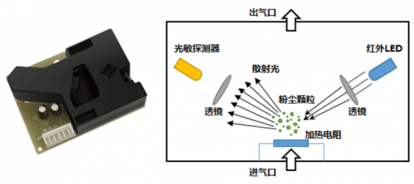 早期的粉塵傳感器,主要使用紅外LED作為光源,通過電阻發(fā)熱以獲得熱氣流流動。當有空氣中有顆粒物通過時,接觸到LED光源之后發(fā)生散射,被光敏探測器接收到后產(chǎn)生不同大小電信號,經(jīng)放大、運算后得到檢測結果。此項技術中,由于LED散射光強度較低,加熱電阻產(chǎn)生的氣流較弱,通常只對直徑大于1μm的較大顆粒有效,且只能通過電信號占空比表征空氣中的顆粒物變化情況,測量數(shù)值誤差較大化,且無法適應塵源變化環(huán)境,難以實現(xiàn)對PM2.5等顆粒物的實時監(jiān)測。