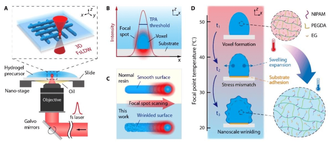 熊偉教授團(tuán)隊(duì)提出了一種自下而上的激光直寫組裝策略,通過單一材料一步工藝實(shí)現(xiàn)了多維度納米褶皺結(jié)構(gòu)的無掩膜制備,打印出了具有高空間分辨率和幾乎任意三維形狀的納米褶皺結(jié)構(gòu)體。該策略利用響應(yīng)性水凝膠前驅(qū)體在超快激光雙光子聚合過程前后的溶脹相變,引導(dǎo)體素單元表面的納米起皺和三維自組織成型。在整個(gè)起皺過程中,僅需在單一水凝膠前驅(qū)體材料中執(zhí)行飛秒激光直寫步驟,通過激光直寫路徑規(guī)劃將納米褶皺體素單元靈活地組裝為一維、二維或三維多層級的納米褶皺結(jié)構(gòu)體。